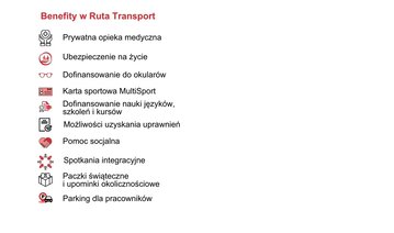 Najważniejszą wartością w Ruta Transport są ludzie. Pracownikom firma zapewnia przede wszystkim przyjazne miejsca pracy, stabilne zatrudnienie i rozwój zawodowy.