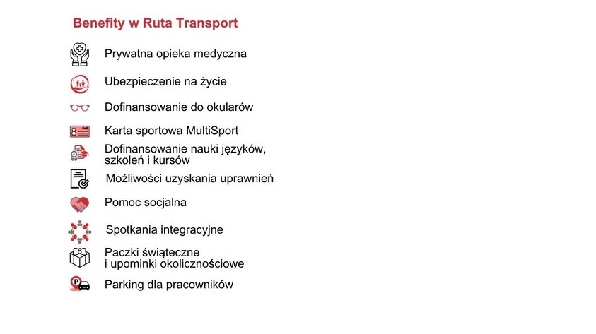 Najważniejszą wartością w Ruta Transport są ludzie. Pracownikom firma zapewnia przede wszystkim przyjazne miejsca pracy, stabilne zatrudnienie i rozwój zawodowy. Dbając o poczucie bezpieczeństwa i realnego wsparcia, oferujemy również szereg benefitów pozapłacowych finansowanych lub współfinansowanych przez pracodawcę.